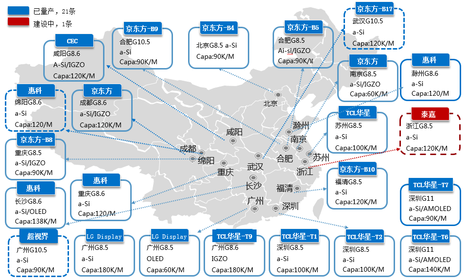 中国大陆G8.5代以上TFT-LCD量产生产线