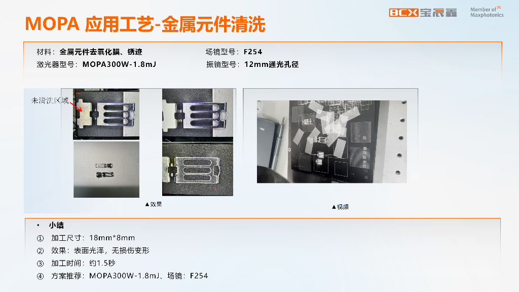 在金属不规则零部件、复杂表面及精细元件的清洗场景中,该方案的应用效果较为显著。据相关项目信息显示,宝辰鑫在某金属元件清洗任务中,采用了 MOPA 300W-1.8mJ 激光器,搭配 12mm 通光孔径振镜与 F254 场镜,通过调整工艺参数后,成功去除了元件表面的氧化膜与锈迹,最终元件表面恢复光泽,且无任何损伤或变形。从作业数据来看,该任务加工尺寸为 18mm×8mm,单工件加工时间约 1.5 秒,推荐配置为 MOPA 300W-1.8mJ 激光器 + F254 场镜。