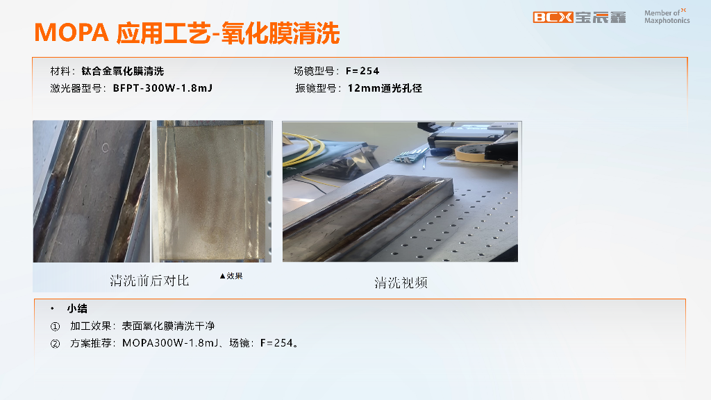 钛合金因机械性能优异、耐腐蚀性强,广泛应用于航空航天、医疗器械、海洋工程等领域,但表面氧化膜或油污会对后续焊接、镀层等工艺产生不利影响。该方案在钛合金氧化膜清洗中,核心光源仍采用 MOPA 300W-1.8mJ 激光器,清洗过程无污染物产生,最终钛合金表面光亮如新,氧化膜清除彻底,推荐配置为 MOPA 300W-1.8mJ 激光器 + F254 场镜。