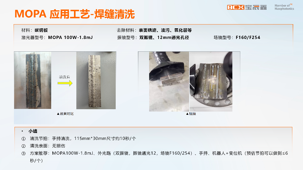 针对碳钢板焊缝清洗需求,该方案采用 MOPA 100W-1.8mJ 激光器,配套 12mm 通光孔径双振镜、F160/F254 场镜及手持清洗头。实际作业中,方案实现了无损伤清洗,有效去除了焊缝表面的锈迹、油污与氧化层。数据显示,对于 115mm×30mm 尺寸的工件,采用手持清洗方式时,单个工件清洗时间约 10 秒;若搭配机器人与变位机使用,预估清洗节拍可缩短至≤6 秒 / 个,推荐配置为 MOPA 100W-1.8mJ 激光器 + 双振镜(12mm 通光)+F160/F254 场镜。