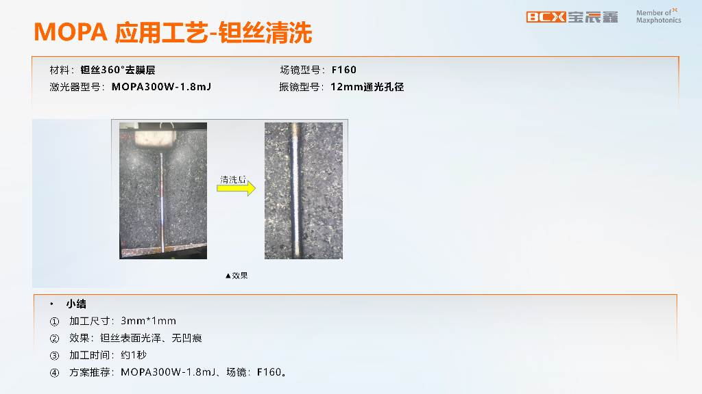 钽丝作为航空航天、真空镀膜、高端电容器等领域的关键特种材料,其氧化膜层清洗对精度要求极高。在此场景中,宝辰鑫采用搭载 MOPA 300W-1.8mJ 激光源的小型化方案,清洗后钽丝表面光泽度良好,且无凹痕等损伤。作业数据显示,3mm×1mm 尺寸的钽丝工件,清洗时间仅需 1 秒,推荐配置为 MOPA 300W-1.8mJ 激光器 + F160 场镜。